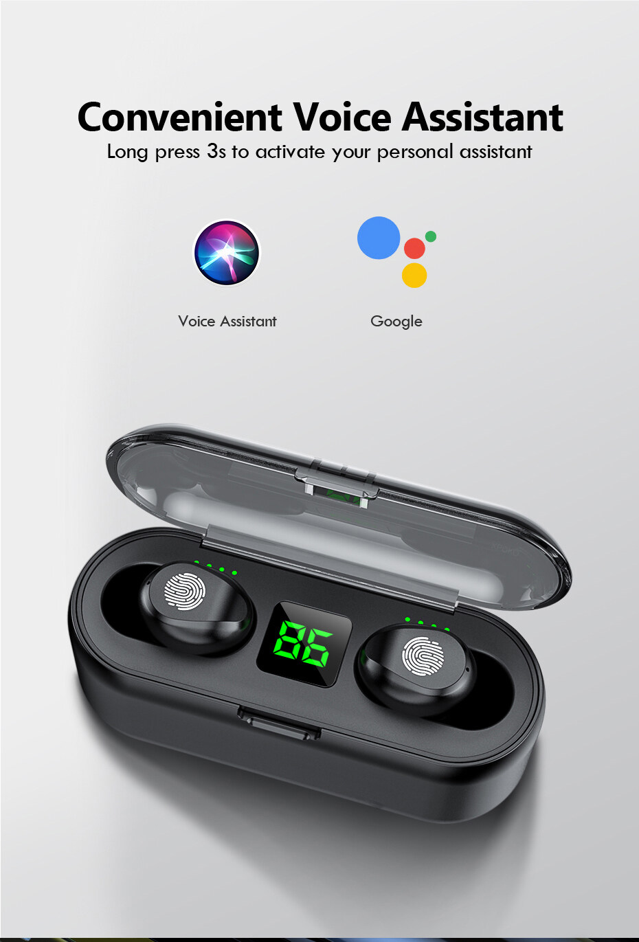 1. Take the earphones out from the charging bin, press and hold the left and right earphones multi-function button for 3 seconds to turn on until the red and blue lights flash alternately, enter the earphone searching state.