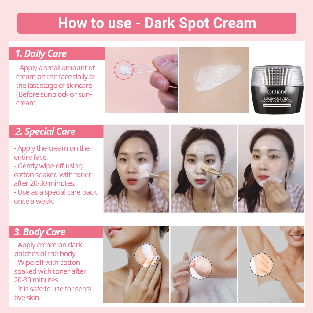 - Option 3_Body Care) Put the cream on the dark patches of the body and wipe off after 20-30 minutes. It is friendly with sensitive skin.