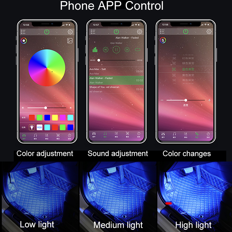 [INTUITIVELY APP INTERFACE] The App of car interior strip lights, connects quickly and is quick and easy to use. With the function of sync to the music surprisingly well, the color can be consistently on, strobe, or play along to music. Hot music and talk features of the lights reacting to sound.