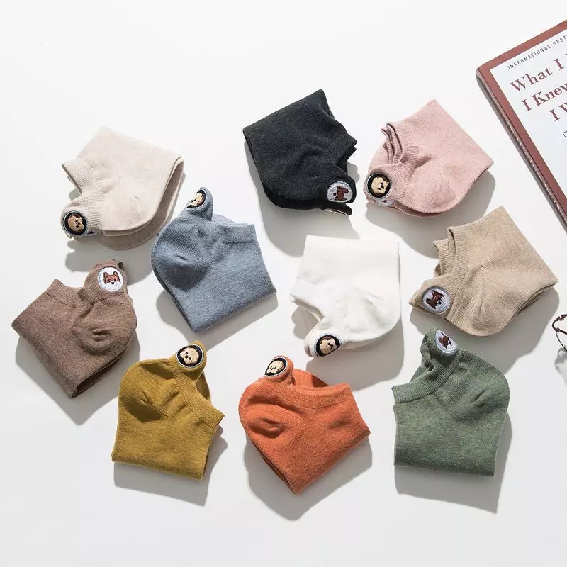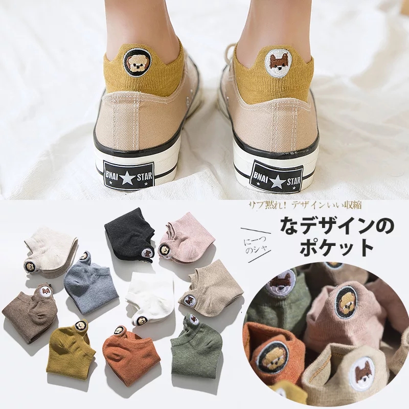 (10 pairs)Woman Cute Embroidered Cartoon Bear Cotton Socks Kawaii Candy Color Breathable Comfortable Boat Socks Female Casual Sock Ladies Ankle Socks