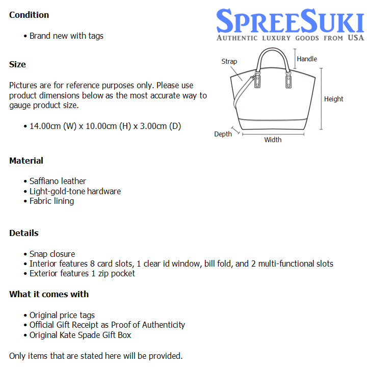 All our products are 100% authentic and purchased from Kate Spade stores in USA. We are a reputable registered business in Singapore and it is illegal to sell counterfeit goods in Singapore. This product also comes with a gift receipt which is printed by the Kate Spade store that we purchased the item from. It states the item that we purchased and the Kate Spade store that it was purchased from, proving the authenticity of the item. Buy with confidence.