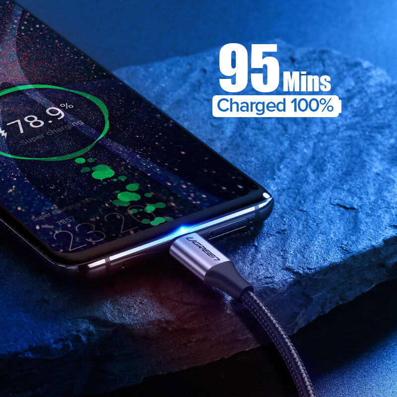 UGREEN USB Type C charging cable supports Huawei FCP fast charge and QC 3.0 quick charge up to 3A max, Which enables it to charge Qualcomm Quick Charge supported phones at full speed. It takes shorter than 2h to finish charging a Samsung S9, as fast as the original cable.