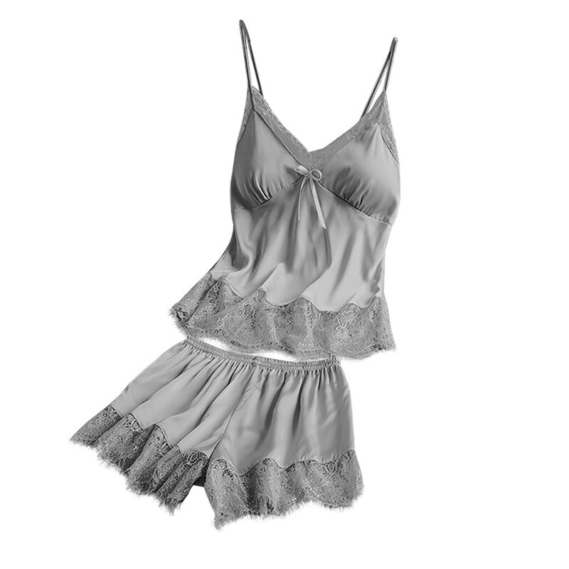 Features:Women Pajamas Set Solid Color Sleepwear Lace Camisole High Waist Short Two-piece Set Silk Home WearNotice:For manual measurement, please allow 1-3cm error Size:S-3XLColor:black,blue,pink,gray,green,redMaterial:satin + eyelash lacePackage Includes:a pcs Pajamas SetCare instructions: Hand washing is recommendedSize: please allow 1-2cm differs due to manual measurement, thanks.Note: Due to the difference between different monitors, the picture may not reflect the actual color of the item. We guarantee the style is the same as shown in the pictures, but not the same performance on different bodies as on the model. Thank you!