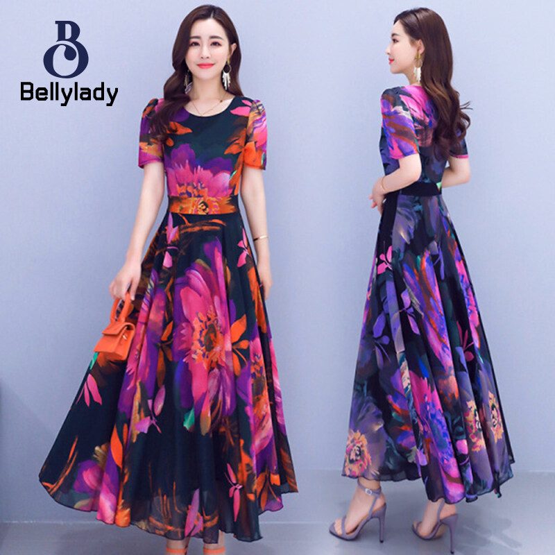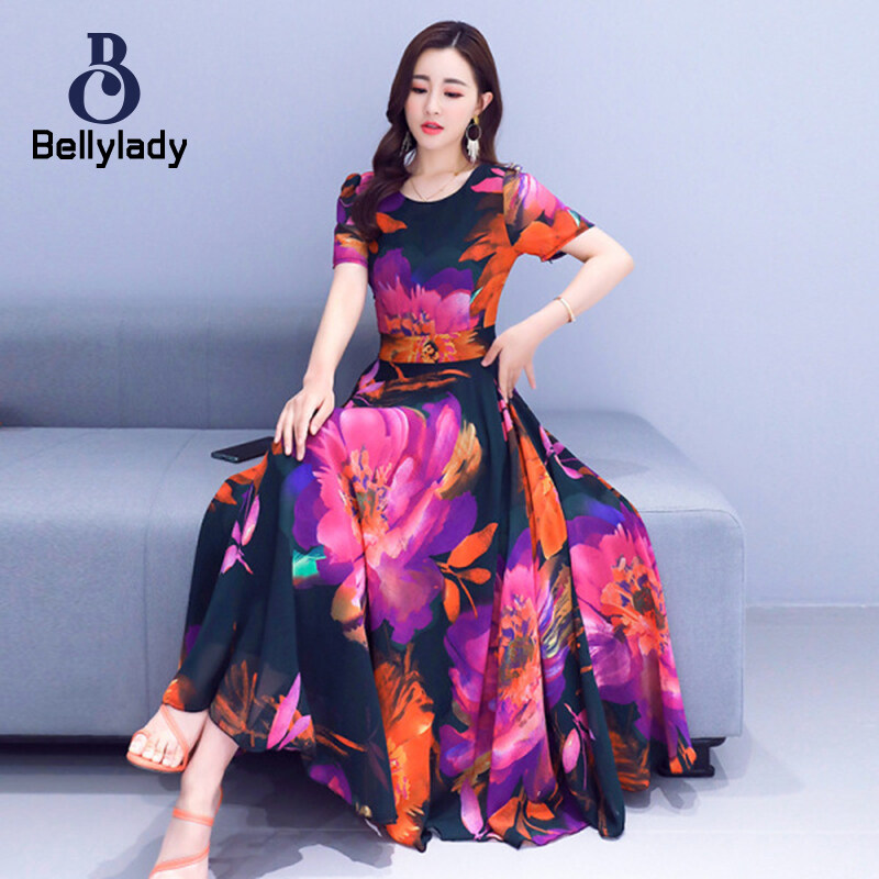 BellyLady Women Dress Plus Size Printed Summer Crew-neck Long Skirt Waist-slimming Big Hemline Dress