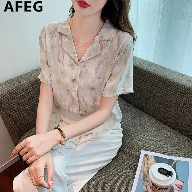 AFEG Korean Style Fashion Loose Versatile Retro Print Chiffon Short Sleeve Blouse for women