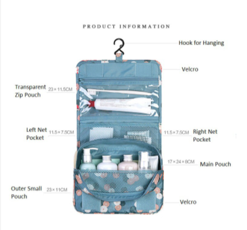 • 1.【Portable】:Toiletry bag, folding design, soft and durable handle on the top of the bag, also can be hung on the wall with a hook after opening.