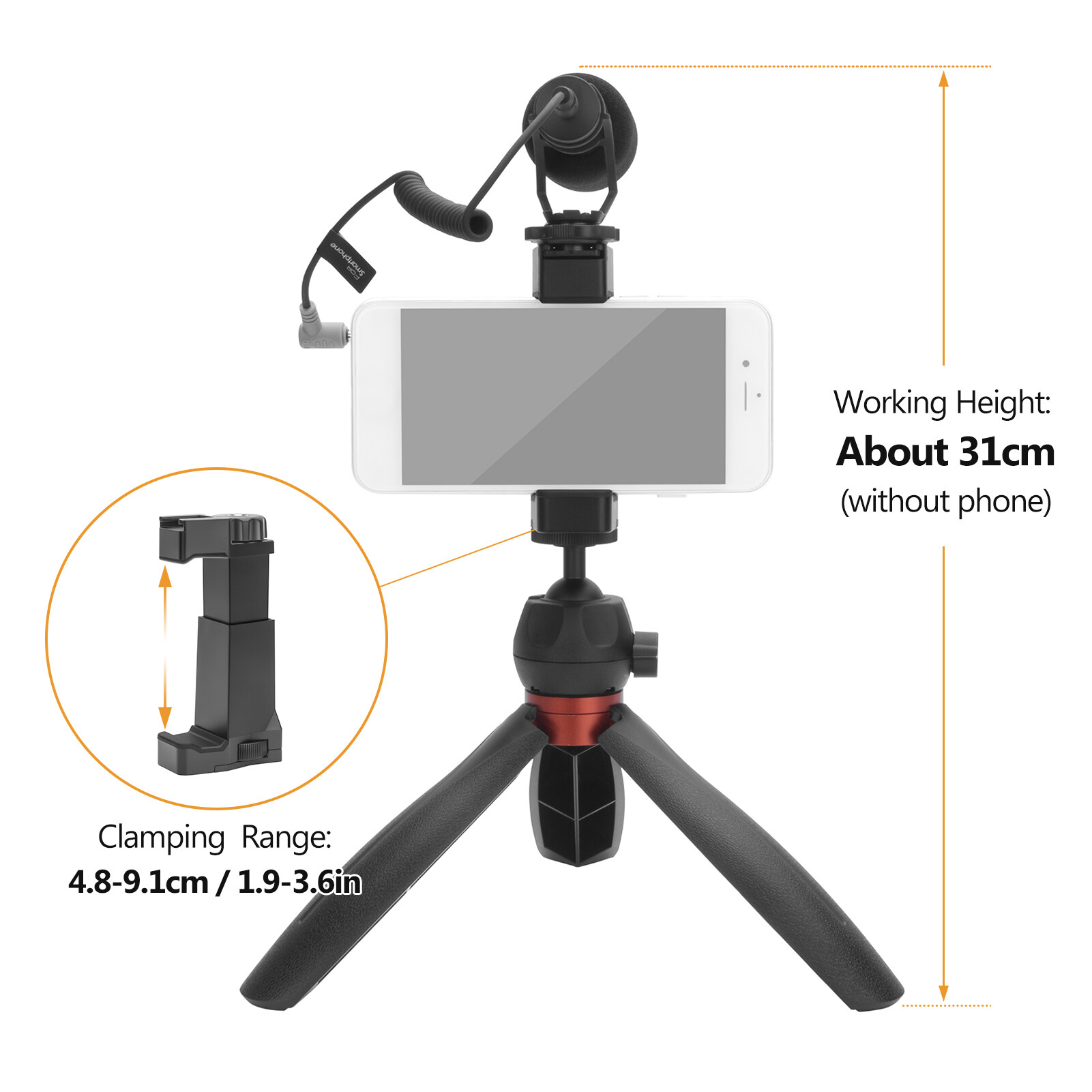 Universal Phone Holder: The phone holder clamping range is about 4.8-9.1cm / 1.9-3.6in, widely for mostly used smartphones. Top cold shoe mount enables quick microphone and LED light mounting.