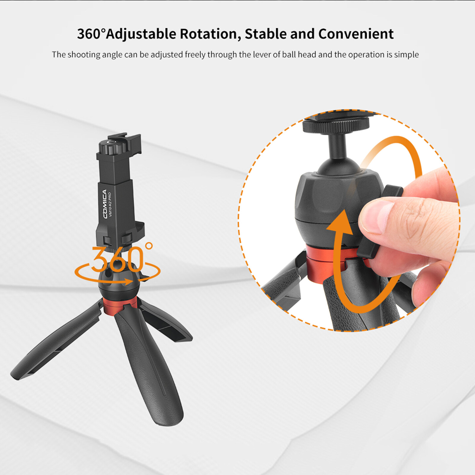 Ball Head Tripod Stand: Mini tripod stand for table setting, 360° swivel adjusting and 90° flip ball head makes horizontal and vertical shooting easier, locked with knob for safer use.