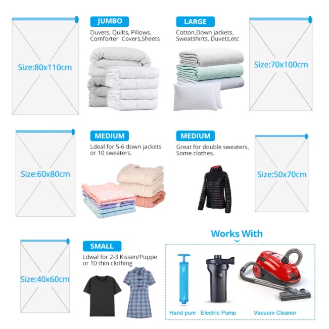 ● Double-zip seal, with plastic valve compatible with a hand vacuum pump or vacuum cleaner to make them air-tight.