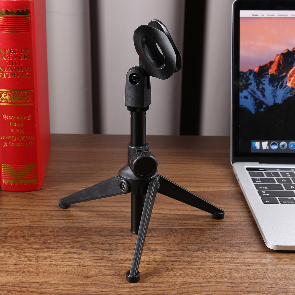 Universal Adjustable Desk Capacitive Microphone Stand Portable Foldable Tripod MIC Tabletop Stand Holder with Microphone Clip Feature: 1. The plastic part is made of ABS high quality material. The foot is made of zinc alloy, which is durable and can be folded with three supporting feet.