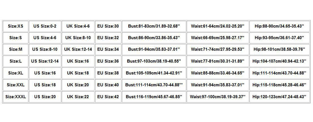 Size:XL US Size:16 UK Size:18 EU Size:38 Bust:105-109cm/41.34-42.91'' Waist:85-88cm/33.46-34.65'' Hip:111-114cm/43.70-44.88''