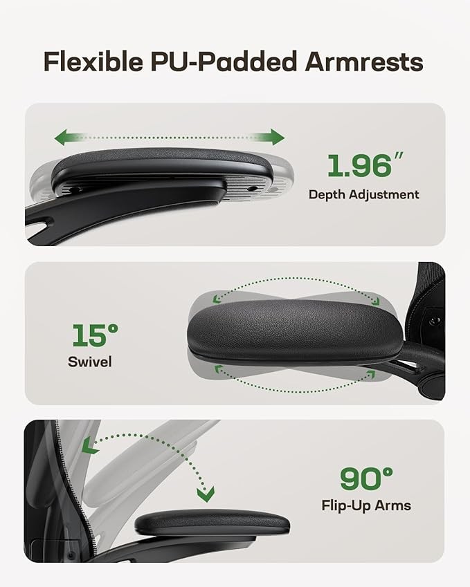 • FLEXIBLE ARMRESTS: Rest your arms on the comfortable PU-padded surface of these smoothly rounded armrests. Move them forward or back and swivel them left or right to find the optimal arm position. Flip the armrests up when you want more freedom or to easily slide the chair under the desk.