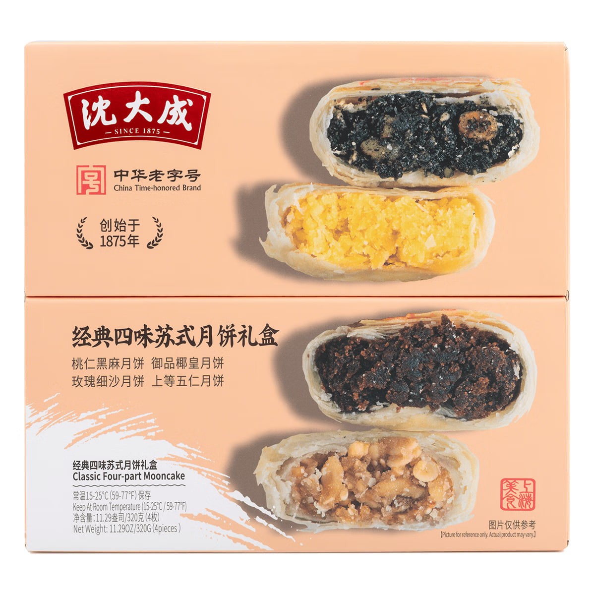 Shen Dacheng (Shanghai Time-Honored Brand) Mid-Autumn Festival Mooncakes - Classic Four-Flavor Suzhou-Style Mooncake Gift Box (4 pieces, 320g) - Black Sesame, Peach Kernel, and Five-Nut Flavors