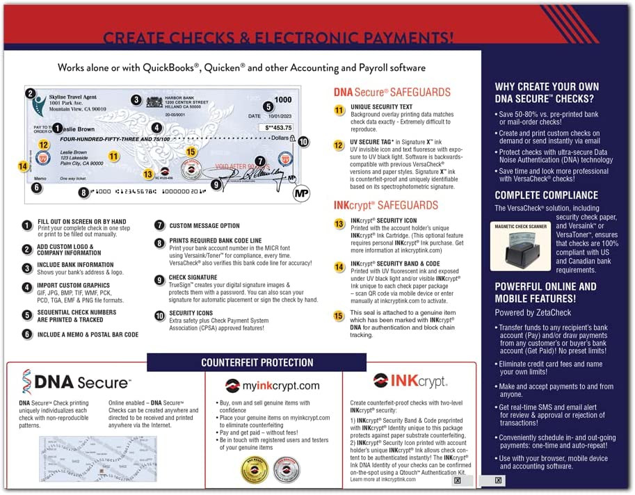 Includes VersaCheck Software Download, License for 5 Users, and 165 Print Validation codes. Additional print codes included FREE in VersaCheck Check Paper packaging.